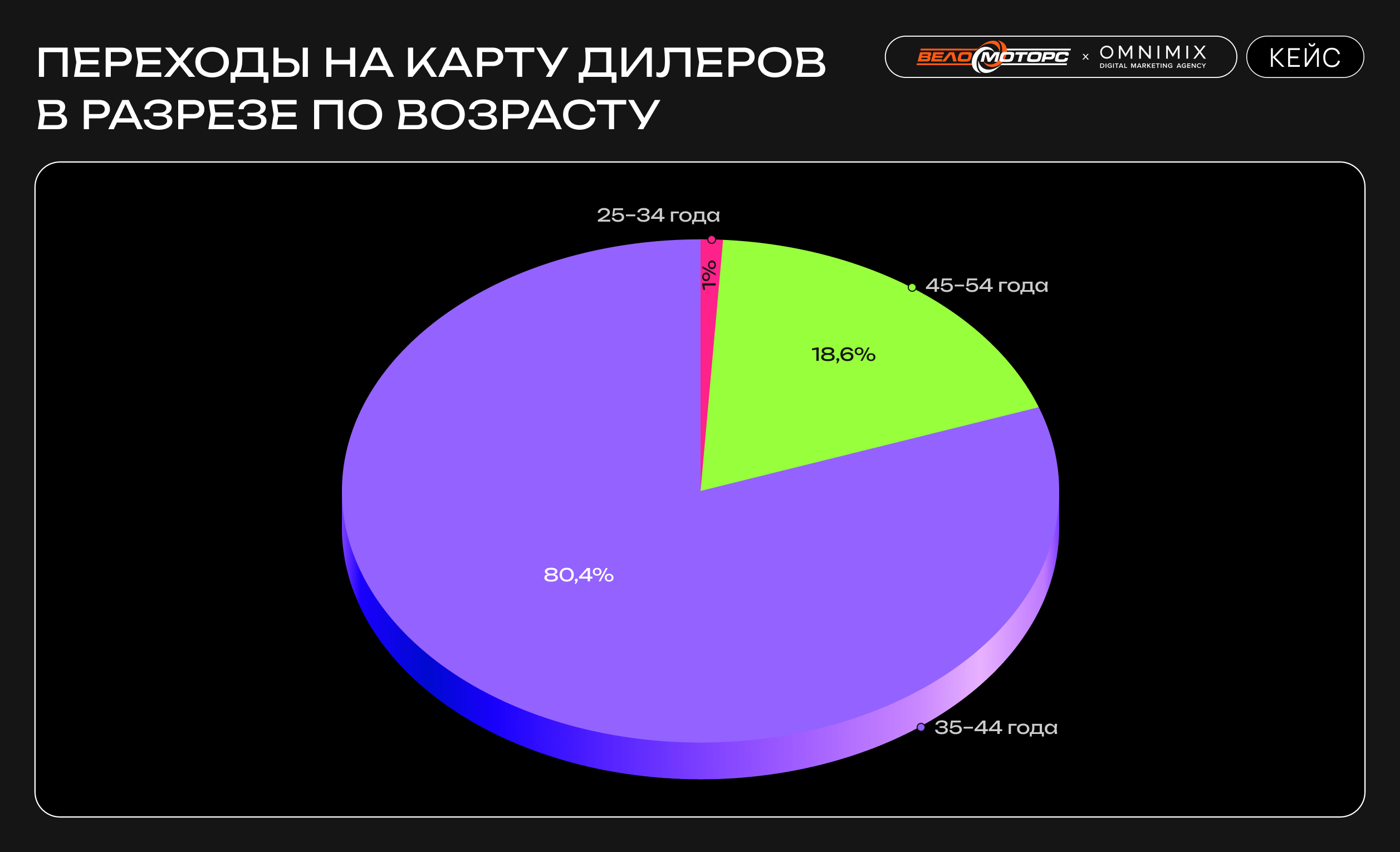 Возрастная сегментация. Большинство переходов в карту дилеров обеспечила аудитория 35-44 лет (80,4%) — приоритетный сегмент клиента. Вторичный таргетинговый сегмент 45-54 лет показал меньшую активность (18,6%).