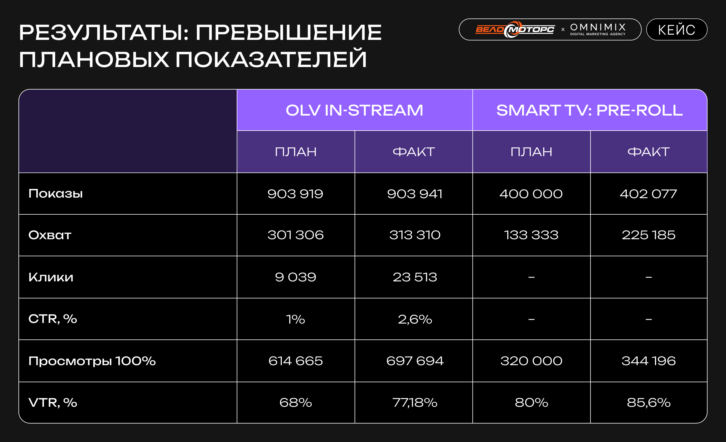 Все запланированные медийные показатели были достигнуты и превышены. OLV-сегмент показал двукратное перевыполнение по количеству кликов. Показатель VTR 77,18% превосходит среднерыночные стандарты для 28-секундных роликов и подтверждает заинтересованность аудитории.