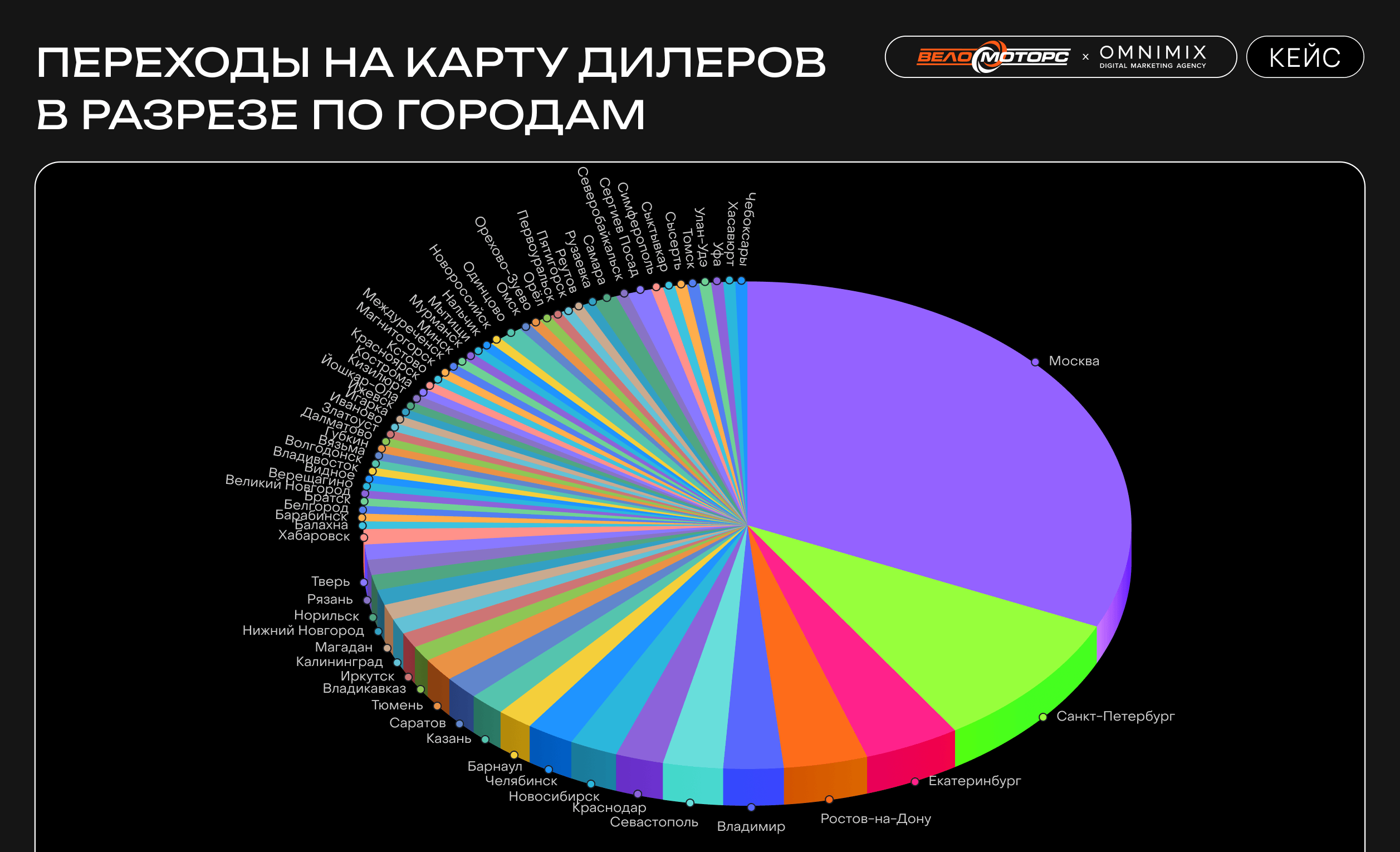 География лидов. Основная доля трафика в карту дилеров сформирована Москвой (31,8%) и Санкт-Петербургом (9,1%). Значительный вклад внесли Екатеринбург (4%) и Ростов-на-Дону (3,5%). Остальные города обеспечили от 0,5% до 2,5% каждый, создав широкое покрытие.