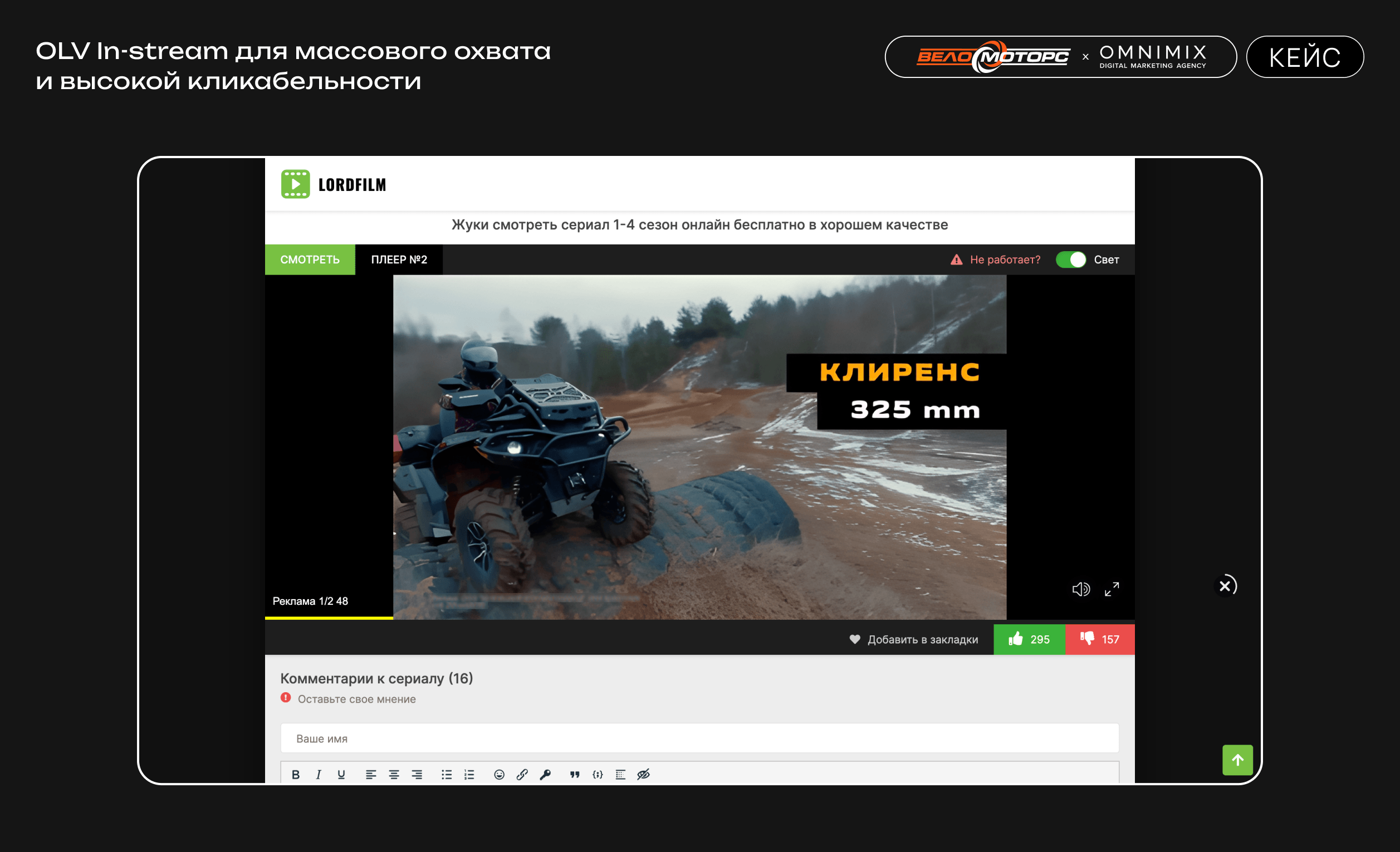 • OLV In-stream для обеспечения массового охвата и кликабельности.