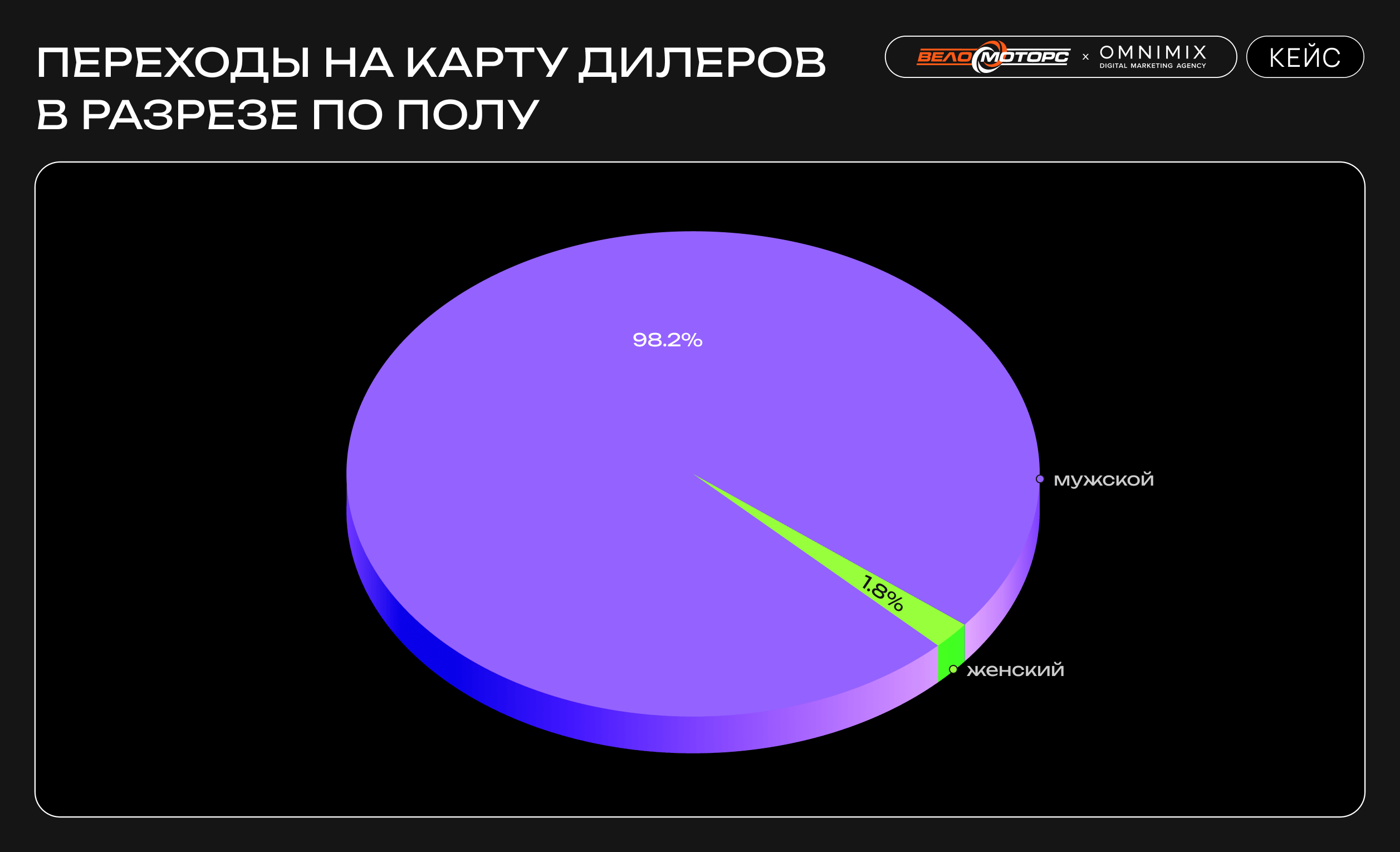 5. Точность таргетинга подтверждена данными. Мужская аудитория составила 98,2% всех переходов в карту дилеров — подтверждение попадания в целевые группы.