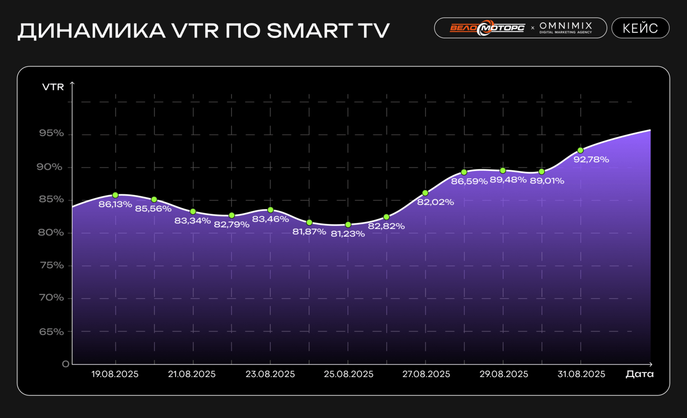 В Smart TV сегменте показы распределялись равномерно. Несмотря на технические сложности 26.08, кампания была стабилизирована. К финальному этапу частота контактов возросла до 2,2-2,27, при сохранении высокого уровня досмотров (до 92,78% в заключительные дни). Аудитория не просто воспринимала рекламу, а вовлекалась в контент, демонстрируя заинтересованность без пропуска рекламных роликов.