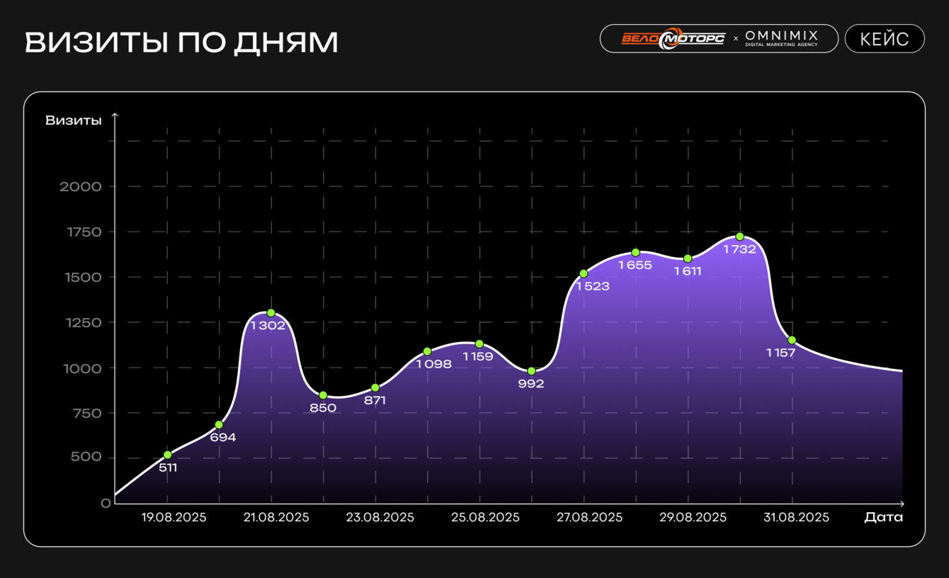 Временная динамика. Первые дни показали постепенный рост до увеличения 21 августа. Период 22-26 августа характеризовался стабильным уровнем визитов с минимальными изменениями. 26 августа наблюдался спад, связанный с техническими неполадками. С 27 августа началась восходящая динамика с достижением максимума 30 августа. Результат накопленного охвата и оптимизационных мероприятий в середине кампании.