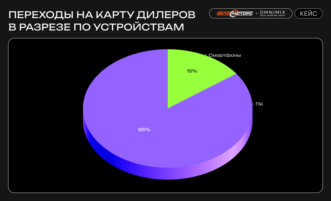 Устройства. Основной объем переходов в карту дилеров реализован через персональные компьютеры — 85%, мобильные устройства обеспечили 15% переходов.