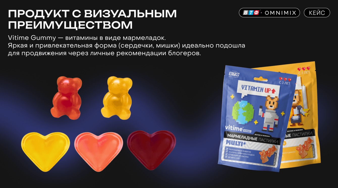 Для продвижения была выбрана линейка Vitime Gummy для взрослых и детей — витамины в форме мармеладных конфет. Этот выбор был стратегически обоснован: необычная форма витаминов (сердечки, кружочки, мишки) делала продукт визуально привлекательным и идеально подходящим для продвижения через личные рекомендации блогеров.