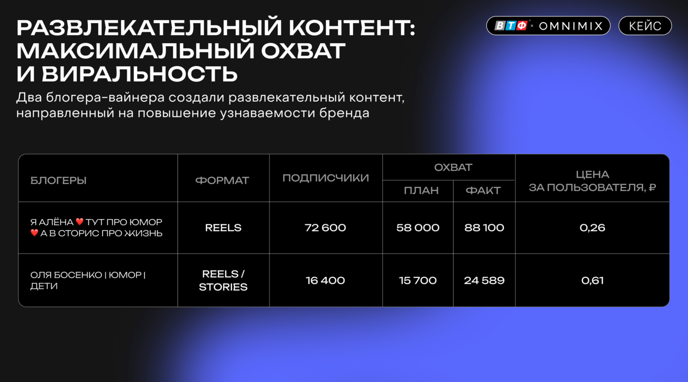 Развлекательный контент обеспечил впечатляющий охват при минимальной стоимости взаимодействия с пользователем, существенно превысив плановые показатели.