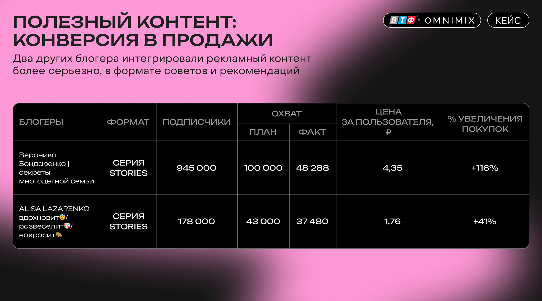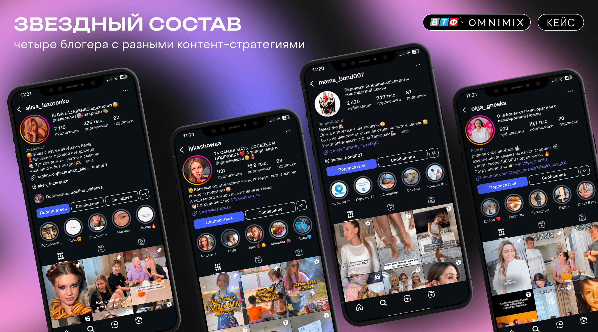 Команда OMNIMIX подошла тщательно к выбору инфлюенсеров для кампании. При отборе учитывались не только количественные показатели, но и качественные характеристики взаимодействия с аудиторией: