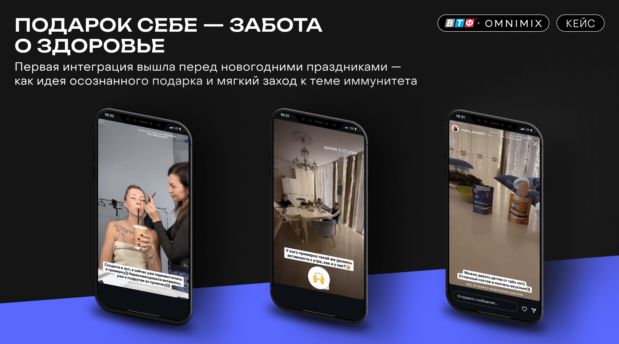 Результаты кампании с OMNIMIX превзошли наши ожидания, особенно в части конверсии. Рост продаж линейки Gummy на 116% у одного из блогеров подтвердил, что даже при недостижении планового охвата можно получить значимый коммерческий эффект. Сбалансированный подход к выбору инфлюенсеров позволил эффективно представить необычный формат наших витаминов разным сегментам аудитории. Считаем удачным решение распределить интеграции между декабрем и январем, что помогло использовать сезонный интерес к витаминам.