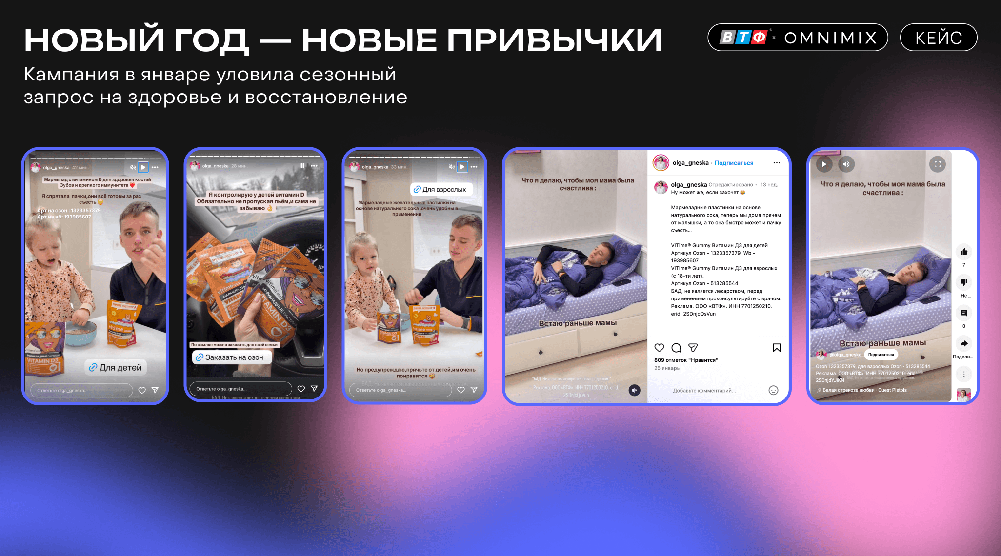 Задача OMNIMIX: усилить позиции бренда Vitime (линейка Gummy) на рынке и повысить доверие аудитории к его продукции с помощью рекламы у блогеров.