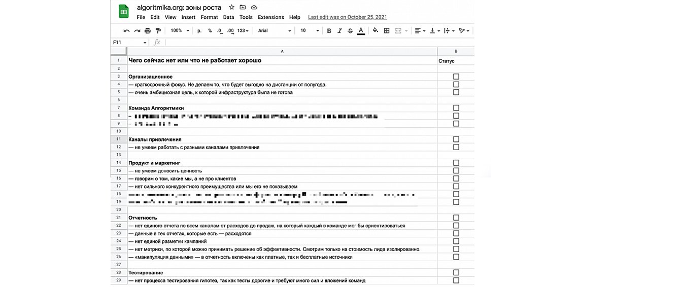 Провели стратсессию, по итогам которой обозначили основные зоны роста: команда, процессы, продукт, каналы привлечения, отчётность.