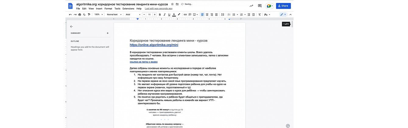 После запуска нового лендинга мы провели коридорное тестирование: опросили семь клиентов, с точки зрения UX и наполнения сайта. Результаты опросов оформили в рекомендации по улучшению лендинга.