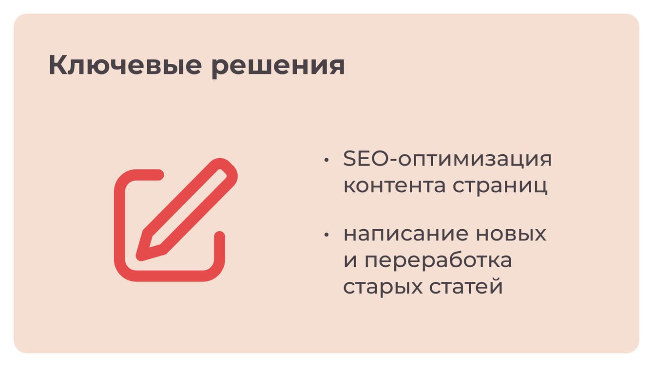 Задачи, связанные с контентом, были полностью реализованы, поскольку они не подвержены техническим ограничениям сайта. В этой части работ мы внедрили все рекомендации.