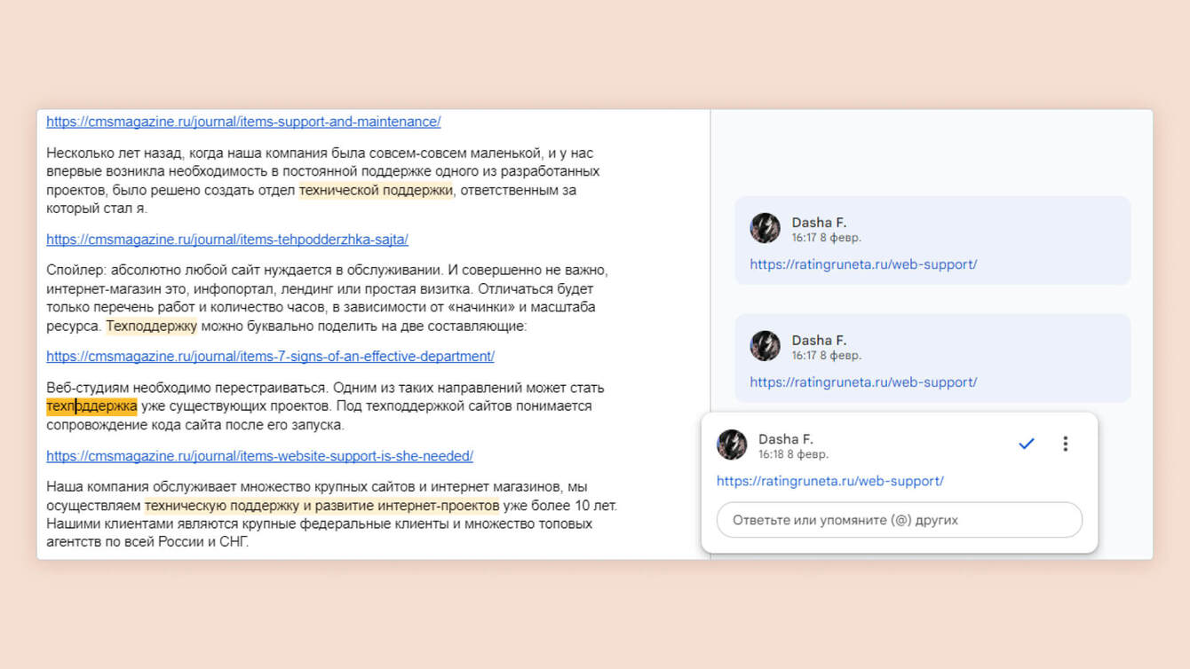 Мы выбирали подходящие части текста, содержащие ключевые запросы, после чего собирали эти отрывки в документе и добавляли в них необходимые ссылки. Этот файл отправлялся Рейтингу Рунета, и специалисты платформы вносили изменения в соответствующие материалы.