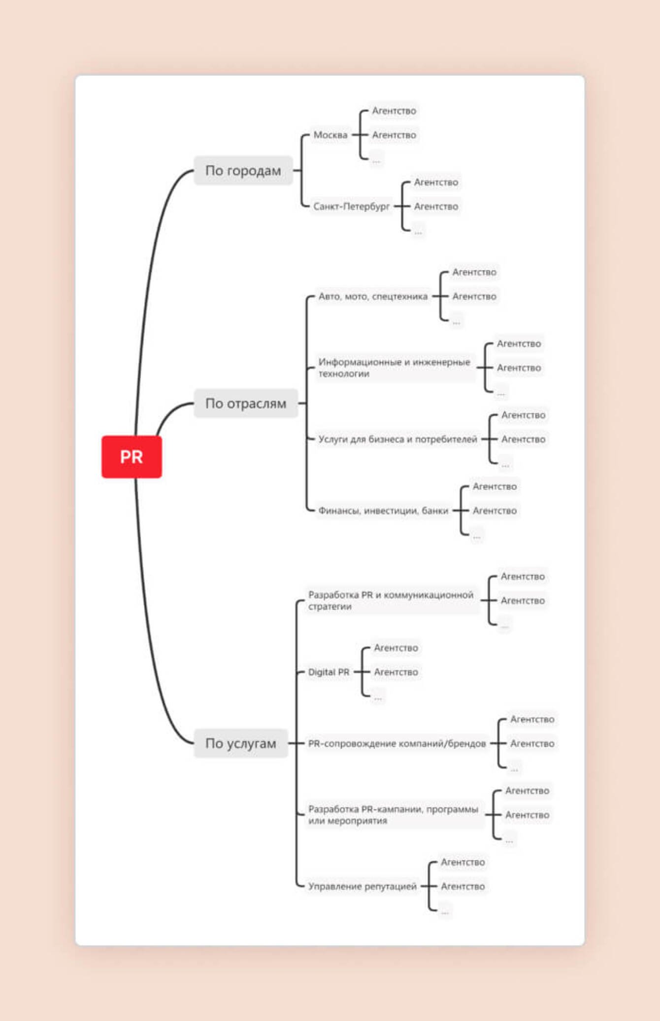 Мы начали работу с рейтинга PR-агентств, для которого была создана SILO-структура с учетом географии, отраслей и услуг.