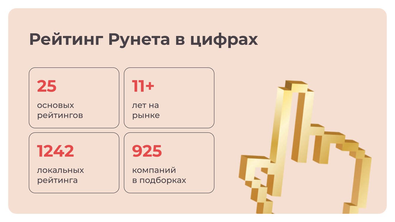Рейтинг Рунета является одним из самых масштабных аналитических проектов в области digital, выпускающих рейтинги лучших цифровых подрядчиков. На сайте компания может найти подрядчика для разработки сайта под ключ, запуска рекламы в сети, разработки дизайна или других digital-услуг.