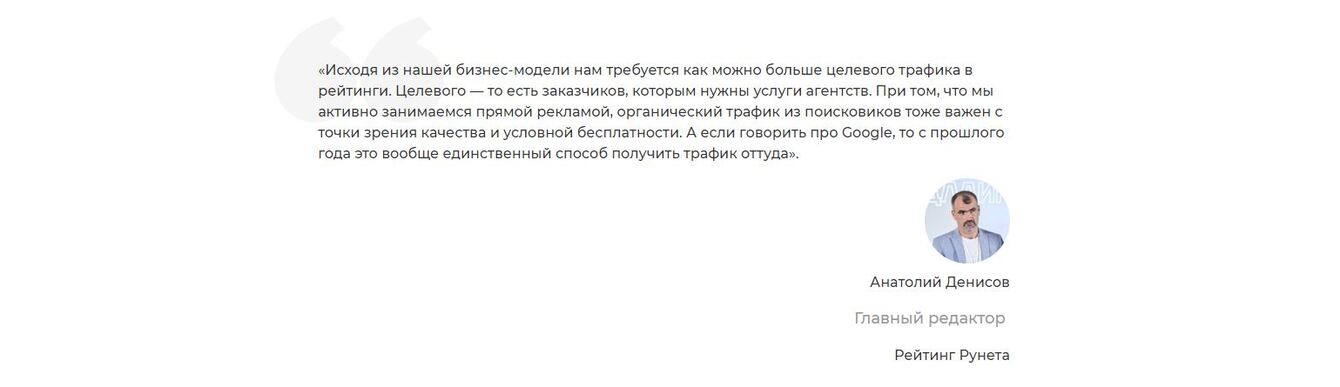 За 11 лет сайт Рейтинга Рунета приобрел репутацию авторитетного ресурса в digital. Несмотря на успех проект стремится к развитию, а не просто поддерживает уже достигнутый результат. Для достижения этой цели Рейтинг Рунета использует различные маркетинговые инструменты, в том числе и SEO-продвижение.