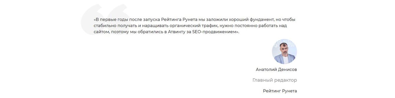 «Первый раз обратил внимание на Атвинту, прочитав кейс о продвижении компании Live Typing — я часто видел материалы из их блога в поисковой выдаче по довольно конкурентным запросам. Почти начали работать, но тогда мы сами поставили задачу продвижения статей на CMS Magazine на паузу. Я запомнил системный подход агентства на этапе обсуждения задачи. И когда мы искали подрядчика для продвижения 9 новых рейтингов, я обратился к Атвинте. Очень радует, что системность, на которую я обратил внимание несколько лет назад, не была единичной. Все задачи чётко планируются и успешно выполняются. И хочу отметить очень небольшое количество ошибок в текстах — нам не нужно внимательно перечитывать всё перед внедрением».