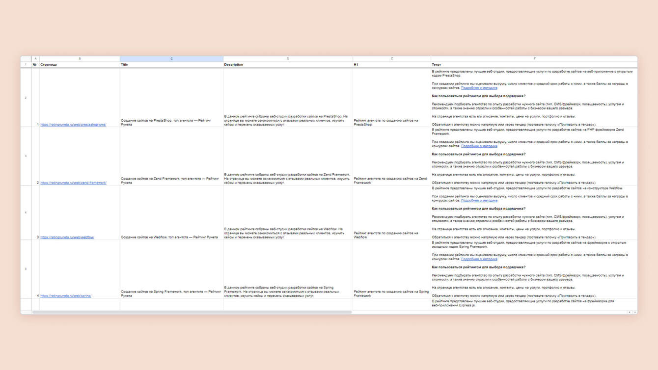 Поскольку задача была срочной и не требовала полной оптимизации текста в тот момент, мы не собирали поисковые запросы для каждой страницы. Для каждой группы рейтингов был создан шаблон, который определял содержание страниц. Мы быстро подготовили нужную информацию и передали Рейтингу Рунета таблицу, контент из сотрудники проекта перенесли на сайт.