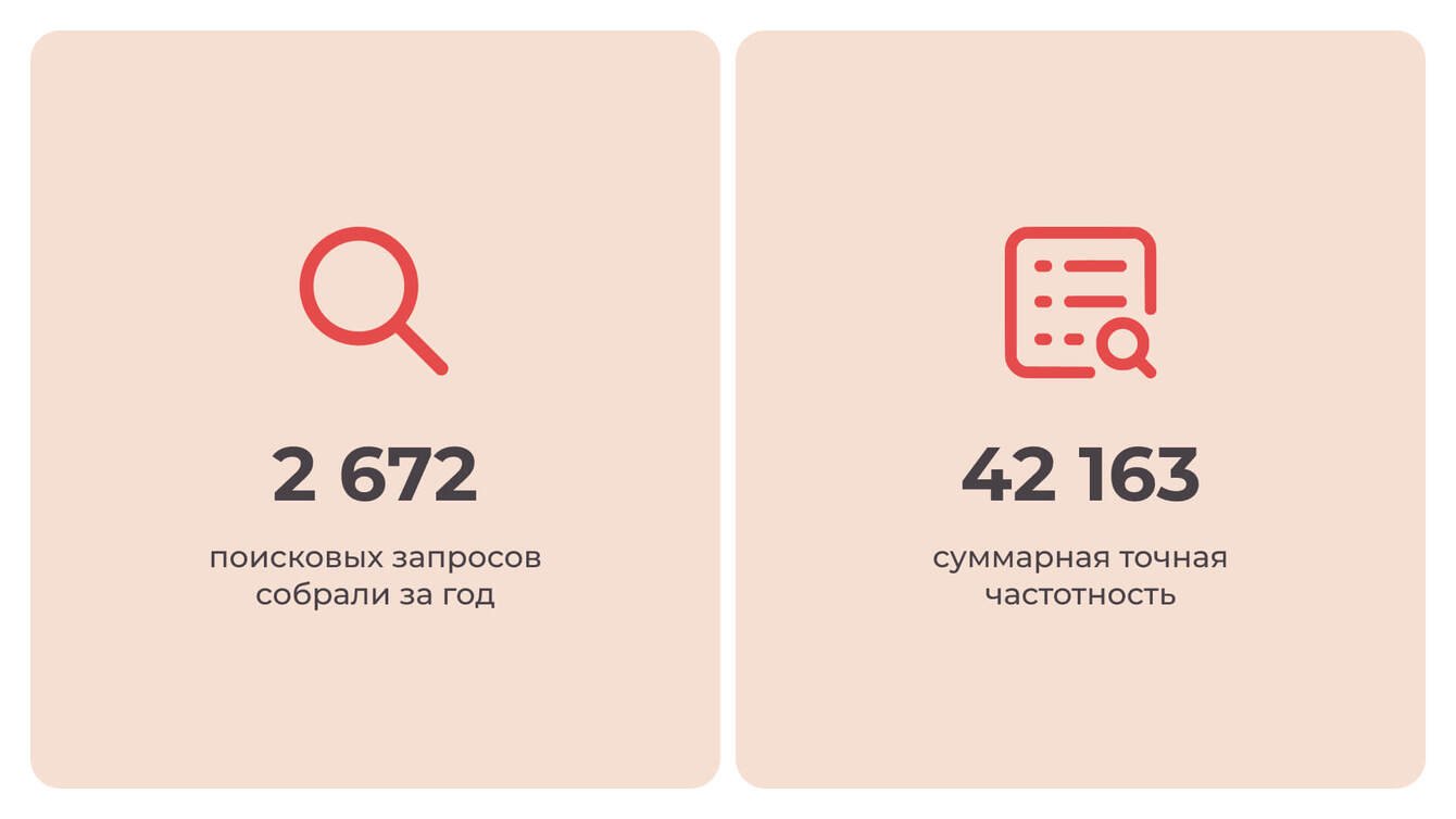 Суммарно за год собрали 2 672 поисковых запроса, точная частотность которых составляет 42 163.