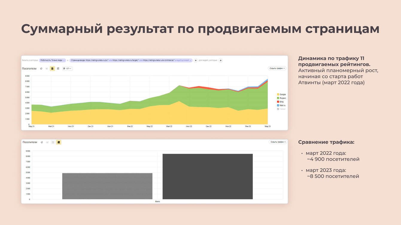 SEO-работы по 11 рейтингам начались в марте 2022 года: за год посещаемость продвигаемых страниц с полной оптимизацией контента выросла в 1,7 раза