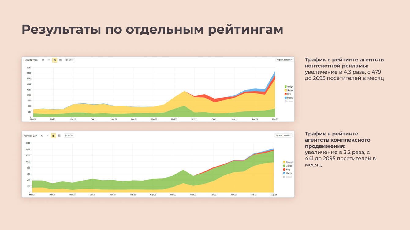 При отдельном рассмотрении рейтингов отмечается многократный рост трафика. Например, посещаемость в рейтинге агентств контекстной рекламы увеличилась в 4,3 раза, а в рейтинге агентств комплексного продвижения — в 3,2 раза.
