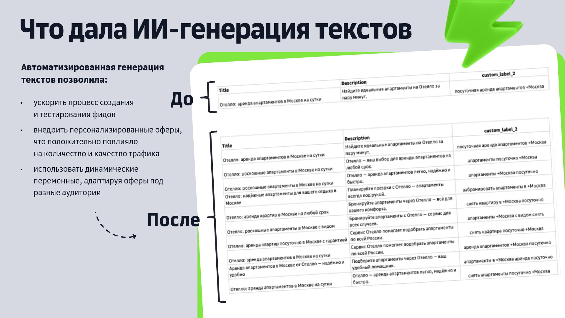 - За счет AI-генерации и мультипликации кастомных фидов обеспечили быстрый выпуск большого количества релевантных объявлений и повышение эффективности размещений