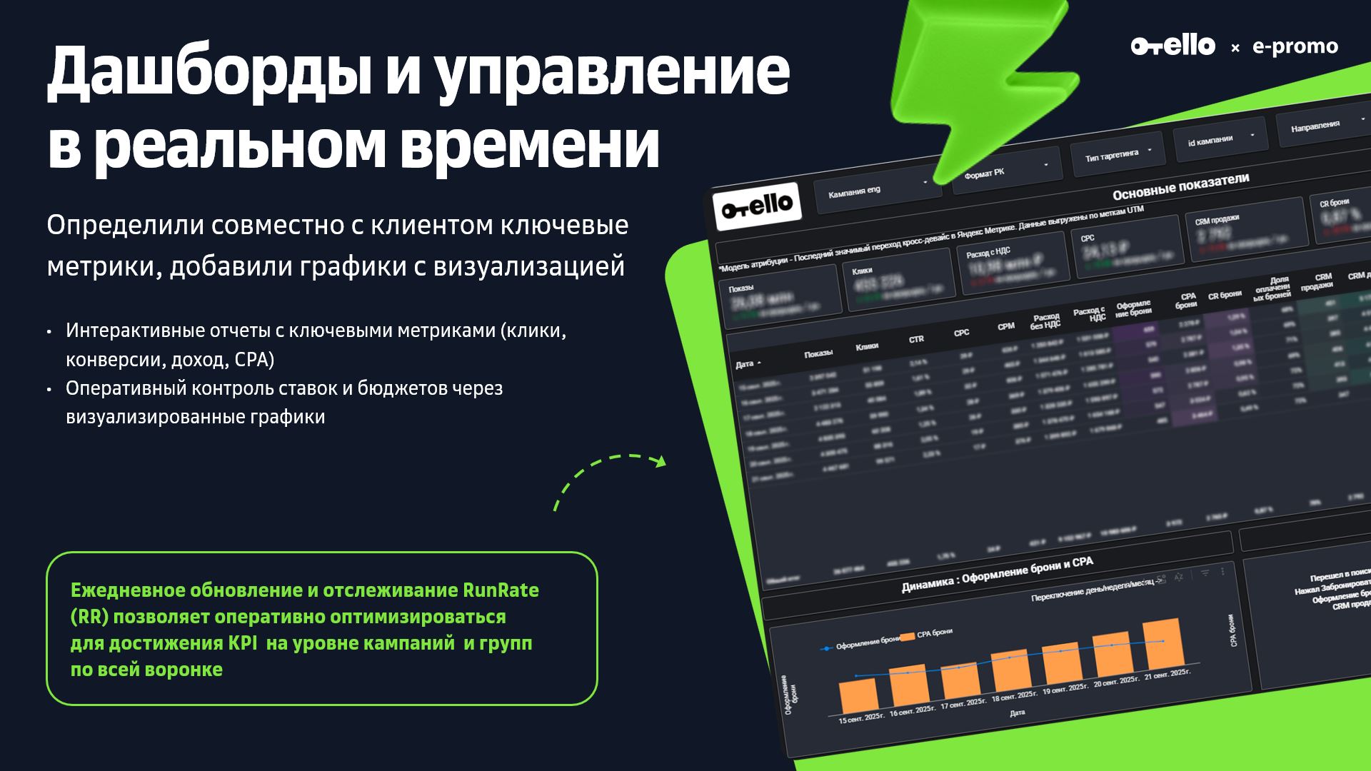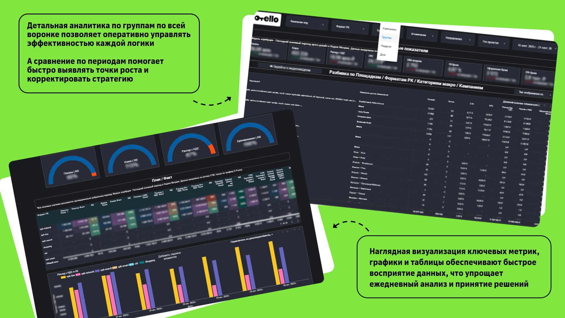 На финальном этапе выстроили регулярный мониторинг качества трафика и выстроили систему аналитики на базе дашбордов, которые агрегировали данные из рекламных кабинетов, Яндекс Метрики и CRM. Это позволило в режиме реального времени отслеживать выполнение KPI, сравнивать план и факт, анализировать эффективность кампаний по каналам и быстро перераспределять бюджеты в пользу наиболее результативных связок.