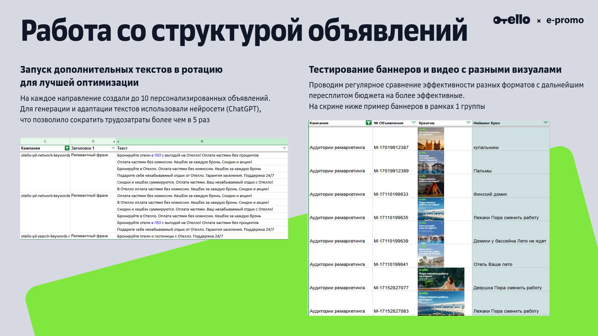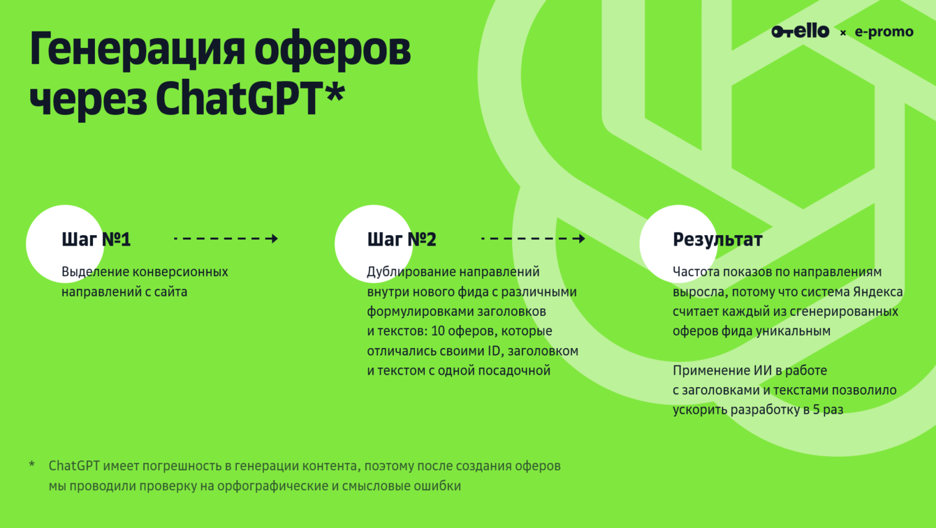 Для повышения эффективности объявлений использовали технологии AI, в том числе ChatGPT. На каждое направление сгенерировали до 10 персонализированных объявлений. Это позволило снизить стоимость закупки и повысить вероятность показа объявления, а кроме этого повысить конверсию. Дополнительно тестировали разные связки оффер — аудитория — формат.