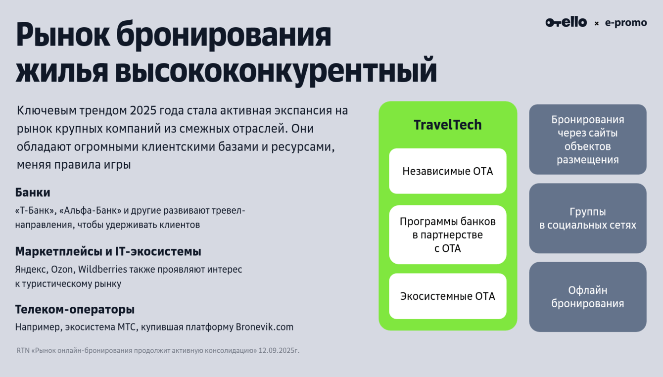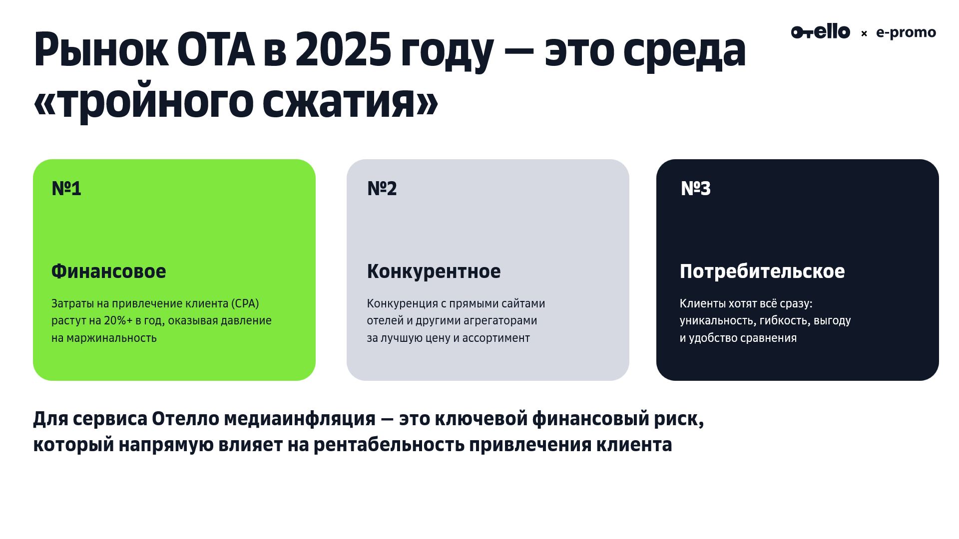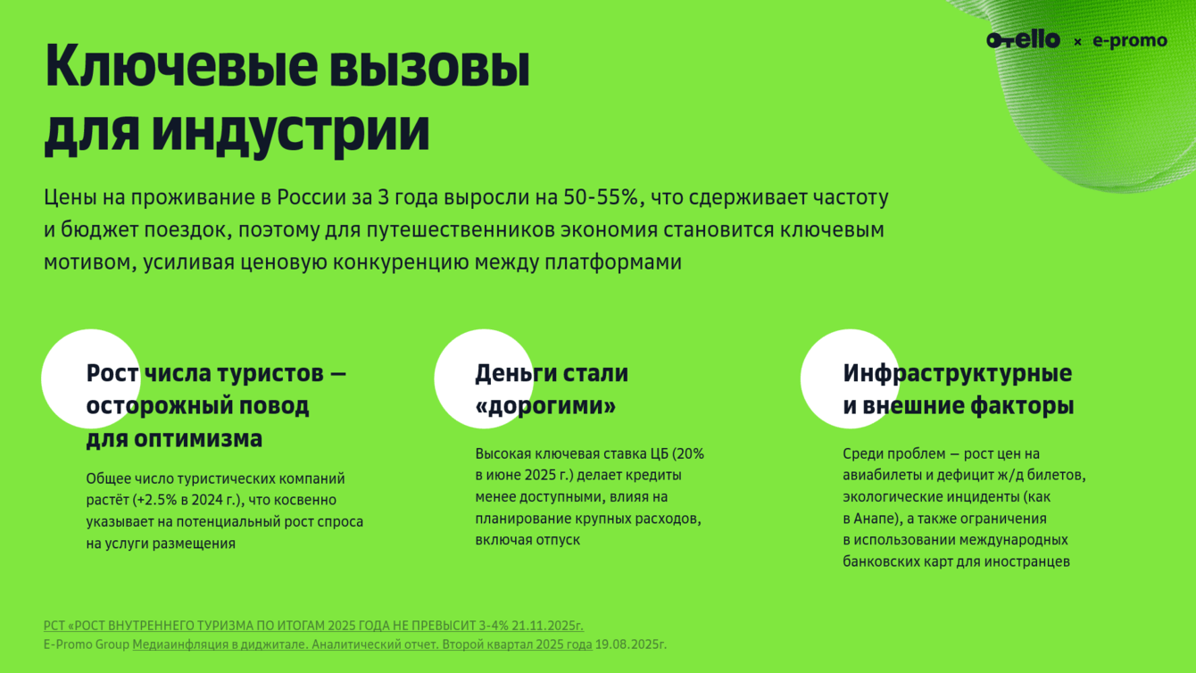 Рынок OTA (Online Travel Agency) в 2025 году находился под давлением медиаинфляции, роста CPA и CPC, а также усиления конкуренции со стороны банков, маркетплейсов и других крупных экосистем. Дополнительно на спрос влияли рост цен на размещение, высокая ключевая ставка и общая ценовая чувствительность аудитории.