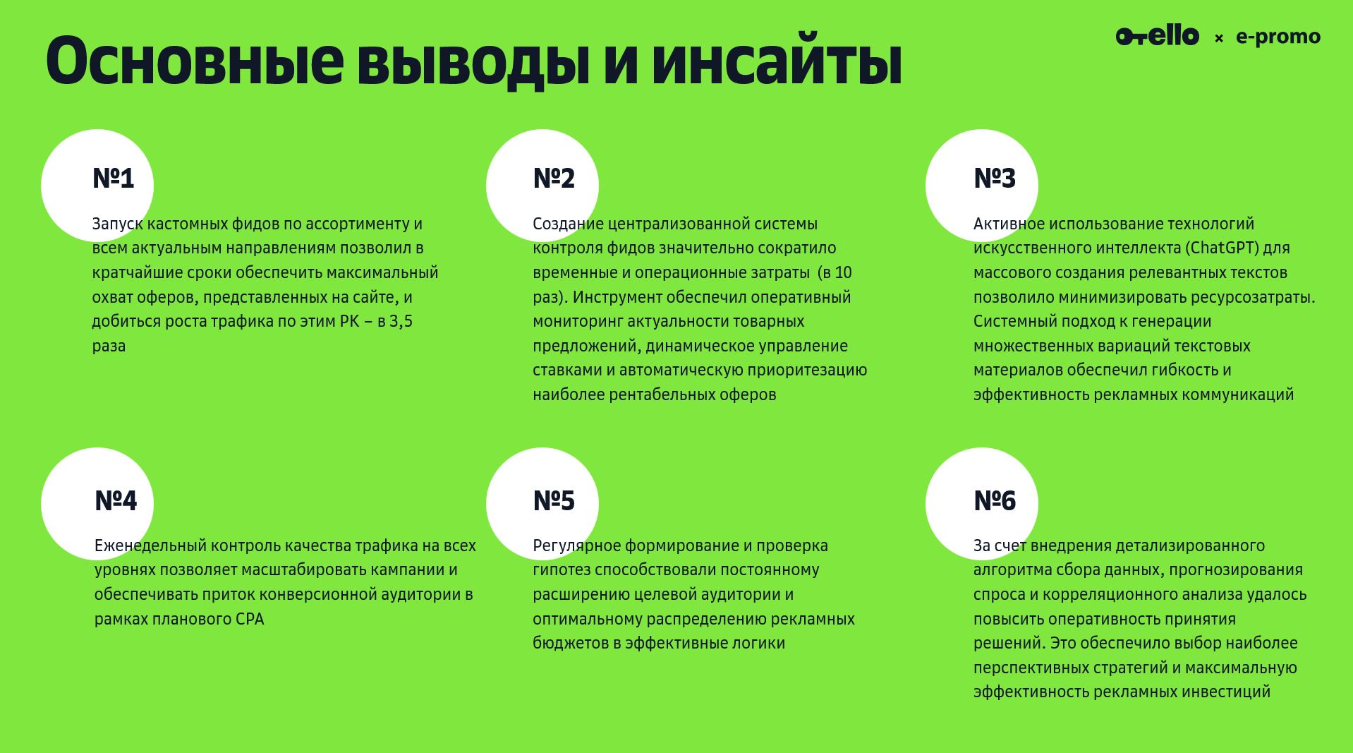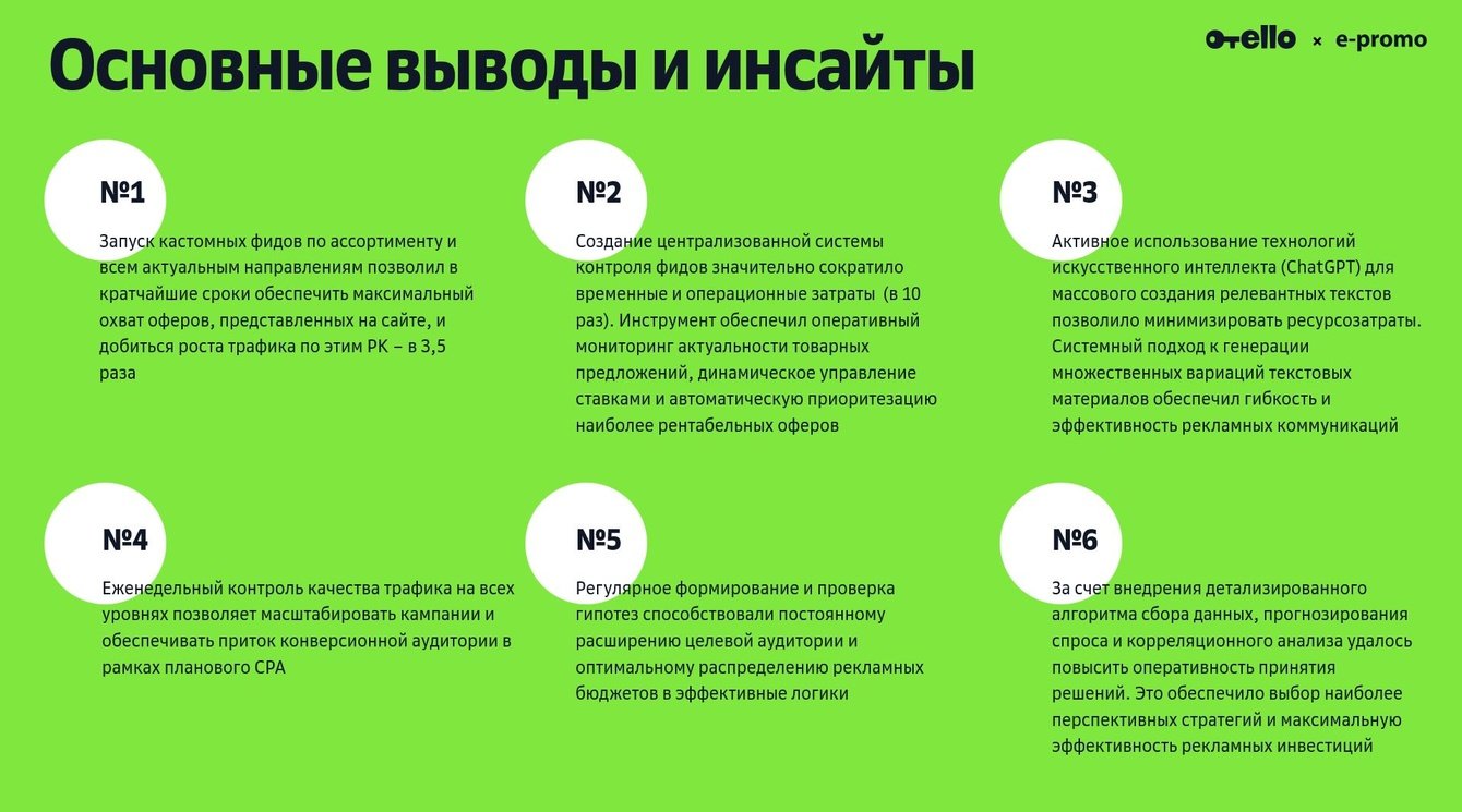 - Масштабировали кампанию без потери эффективности: вместо фокуса на росте бюджета выстроили технологический подход к управлению фидами, креативами и трафиком