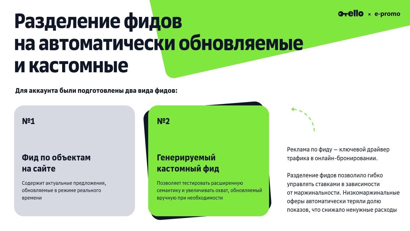 После подготовки инфраструктуры запустили работу с кастомными фидами по ассортименту и актуальным направлениям. Это позволило в короткие сроки охватить весь пул оферов и кратно увеличить трафик по рекламным кампаниям.