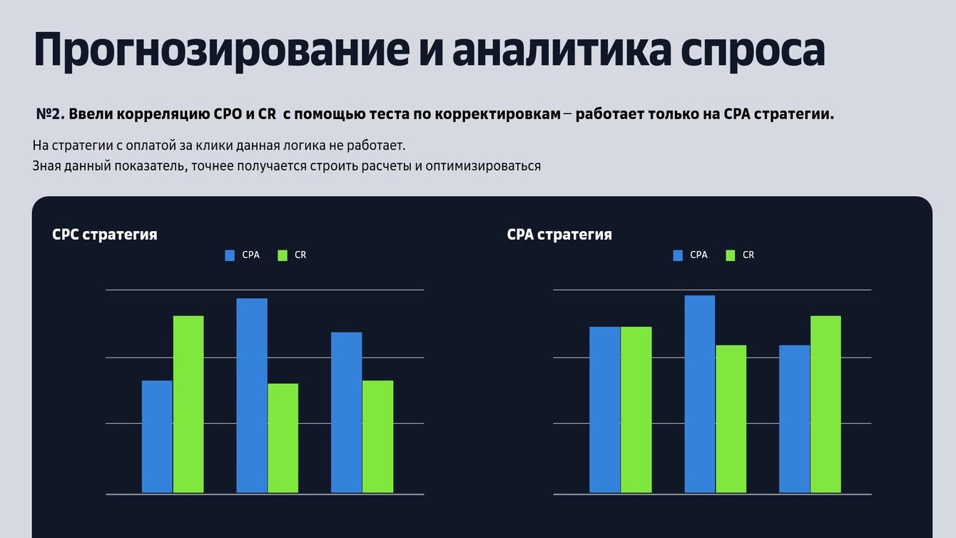 Дополнительно использовали прогнозирование спроса и корреляцию CPO и CR, чтобы точнее планировать масштабирование и удерживать целевой CPO при росте объемов