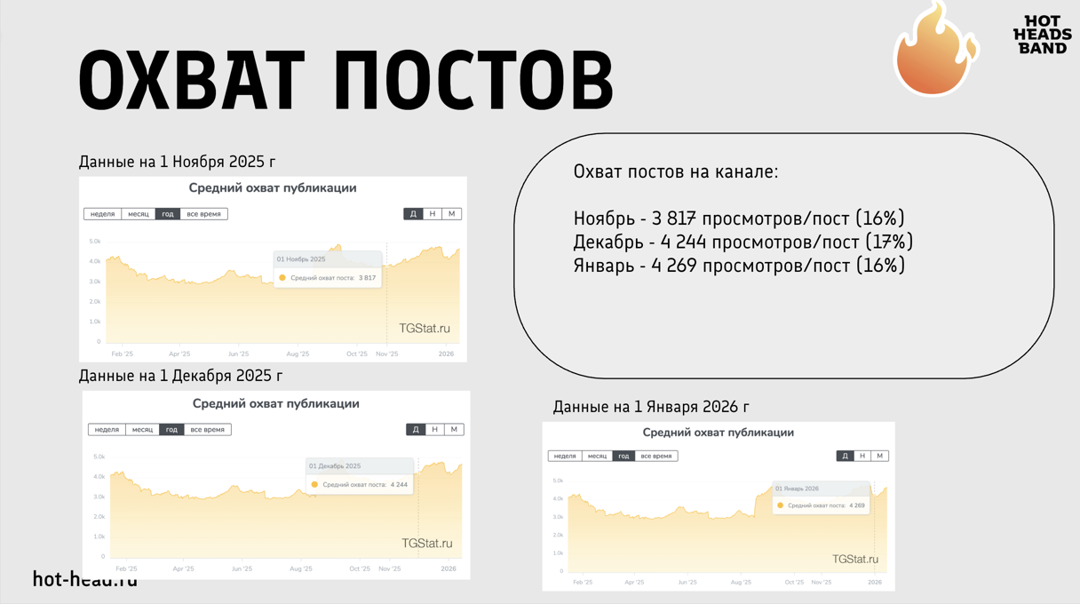 Но была и хорошая новость. Несмотря на рост отписок, показатели охвата не упали. В ноябре охват составлял 3817 просмотров на пост, что соответствует 16%. В декабре — 4244 просмотров на пост, 17%. В январе — 4269 просмотров на пост, 16%. Норма охвата — 10%, хороший охват — 15-20%.