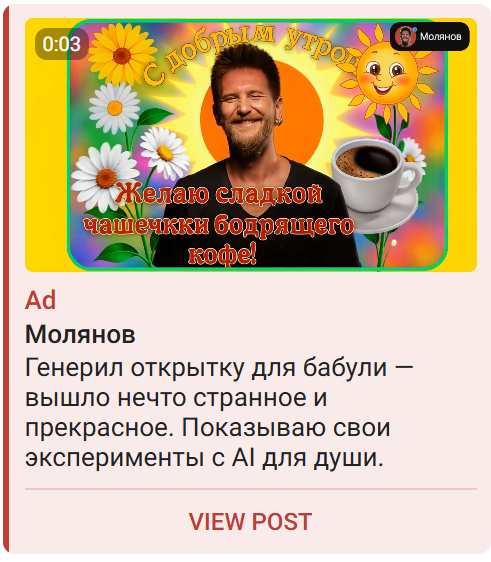 Креативы были самыми разными. Классические баннеры с фото Павла и текстом о запусках. Видео с генерацией через ИИ, например, история про то, как он генерил открытку для бабули. Эмоциональные креативы с акцентом на результаты — «За месяц 4500 юзеров». Креативы в стилистике мемов и неформального общения.