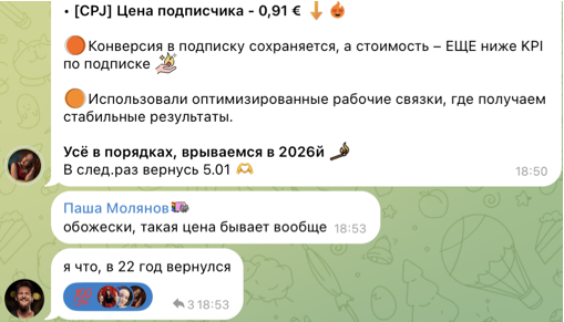Когда Паша обратился к нам в октябре 2025 года, у него уже был опыт продвижения канала через посевы в других Telegram-каналах. Результаты были неоднозначными. Цена подписчика была не стабильной и не предсказуемой и сильно выше желаемого KPI.