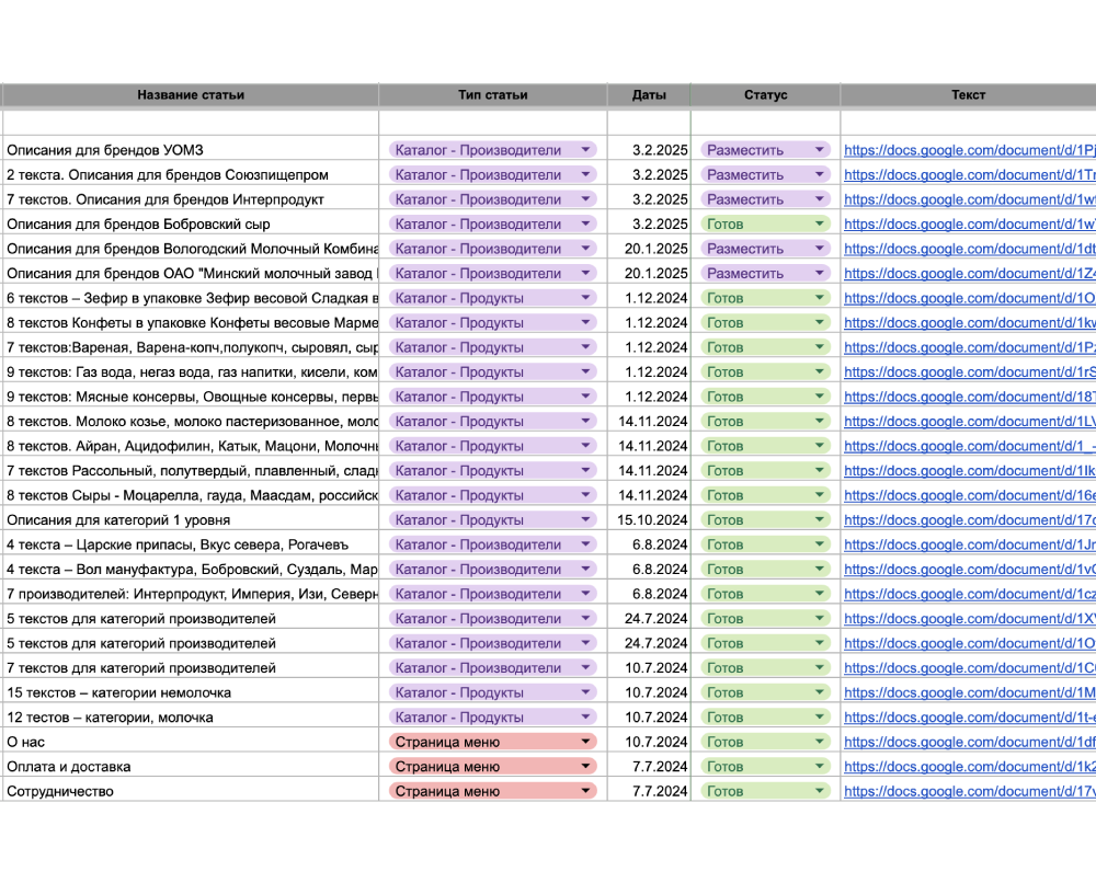 Автоматизация контента. Мы создали Google-таблицу для автоматизации обработки товаров, которая объединила данные из 1С и процессы контентного наполнения:генерация и добавление текстов (в том числе с помощью AI), импорт описаний, фото и метаданных, выявление новых и устаревших товаров, автоматическое формирование редиректов.