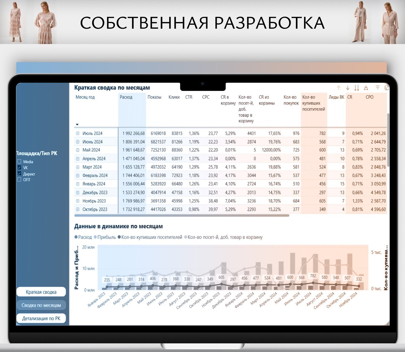 Для эффективного управления рекламными кампаниями наше агентство разработало дашборд на базе Power BI, который обновлялся в режиме реального времени. В нем отображались ключевые метрики: распределение бюджета, динамика показов и кликов, конверсии, стоимость покупки, а также выручка и коэффициент окупаемости инвестиций (ROI) каждого рекламного канала, кампании и даже объявления.