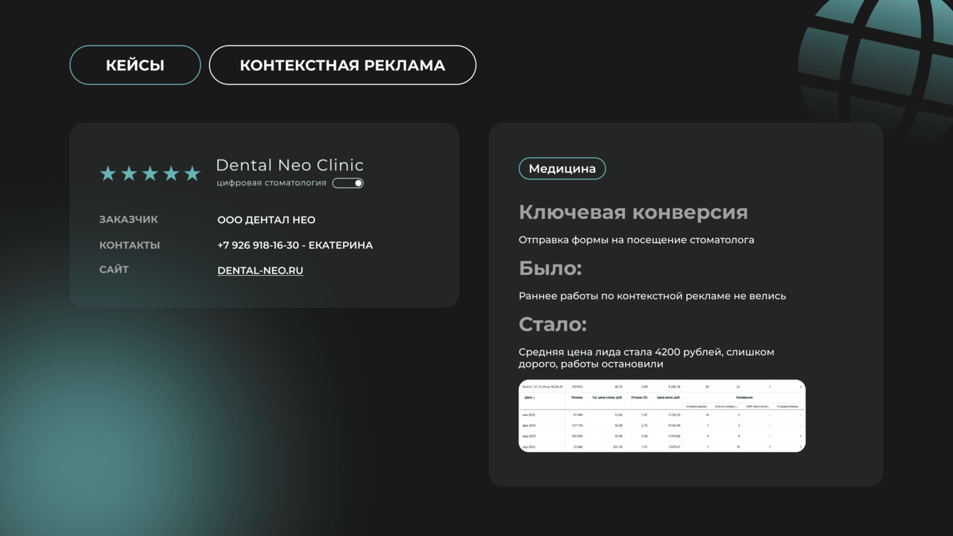 Клиника «Dental-Neo» столкнулась с недостаточным потоком новых пациентов через онлайн-каналы. Существующее присутствие в интернете не обеспечивало стабильного потока заявок на дорогостоящие стоматологические услуги.