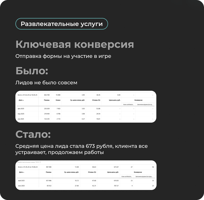 Регулярно обновлялись объявления на основе А/B тестов, отключались неэффективные запросы, уточнялись портреты целевой аудитории. Особое внимание уделялось сегменту корпоративных клиентов и мероприятий.