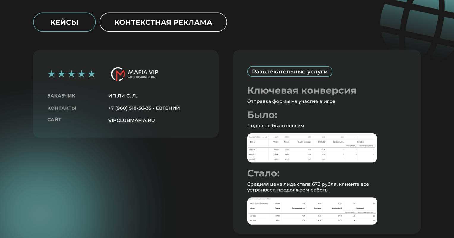 Клиент обратился с запросом на запуск и настройку контекстной рекламы для клуба «Mafia VIP» — первой в городе специализированной студии для игры в мафию. Основная цель — привлечение целевой аудитории, заинтересованной в качественном формате досуга, и увеличение количества бронирований игровых сессий через сайт.