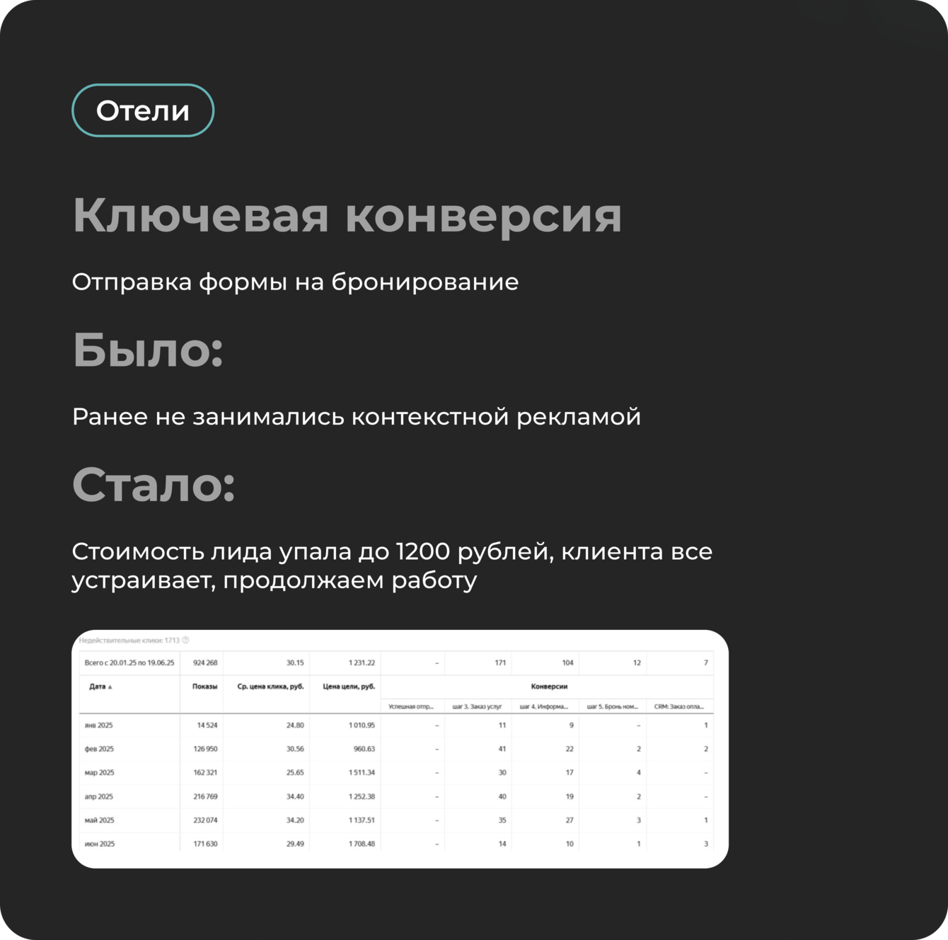 Созданы отдельные кампании для разных сегментов с использованием рекламных форматов: Поиск, РСЯ, КМС. Настроены динамические объявления с актуальными ценами и наличием номеров.