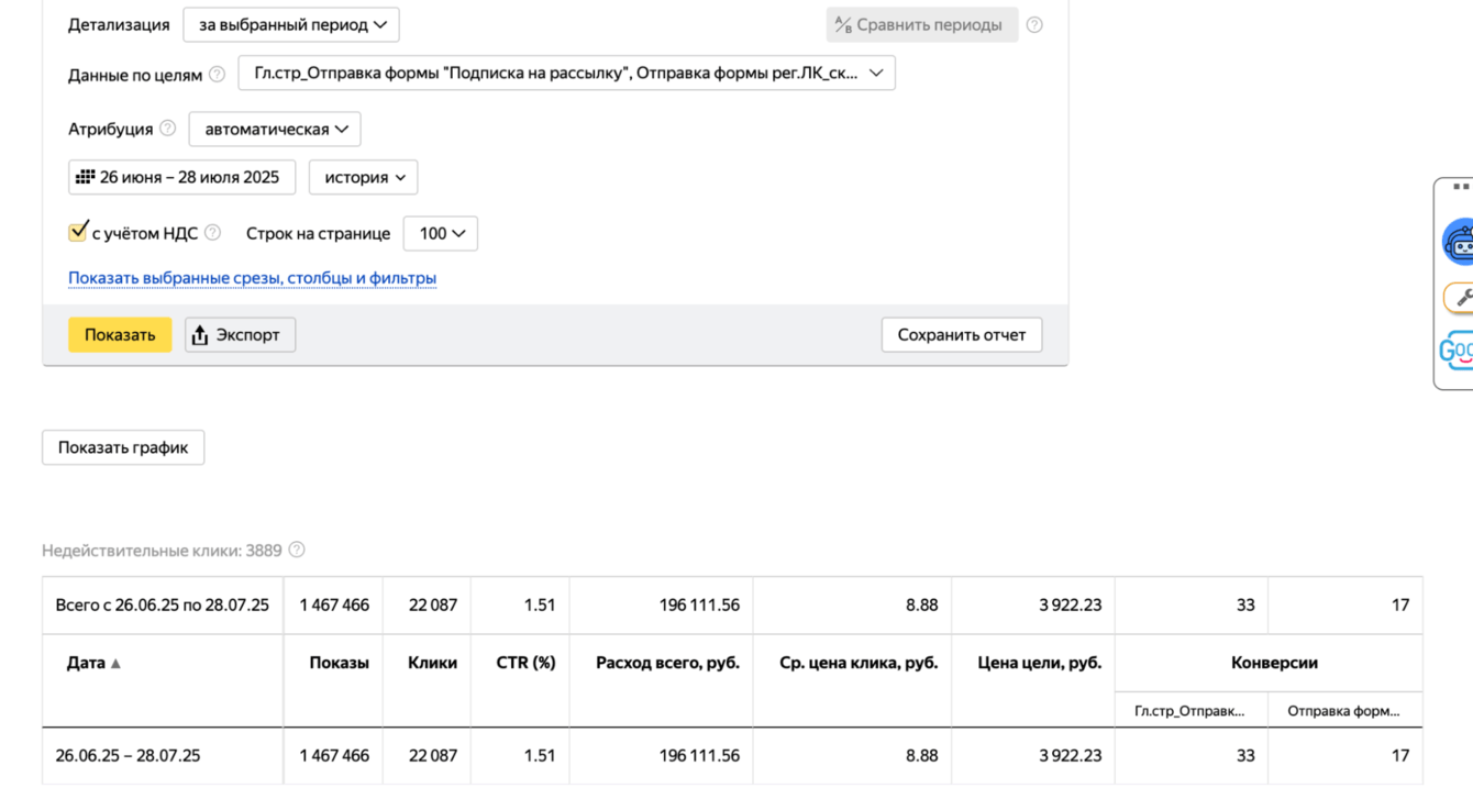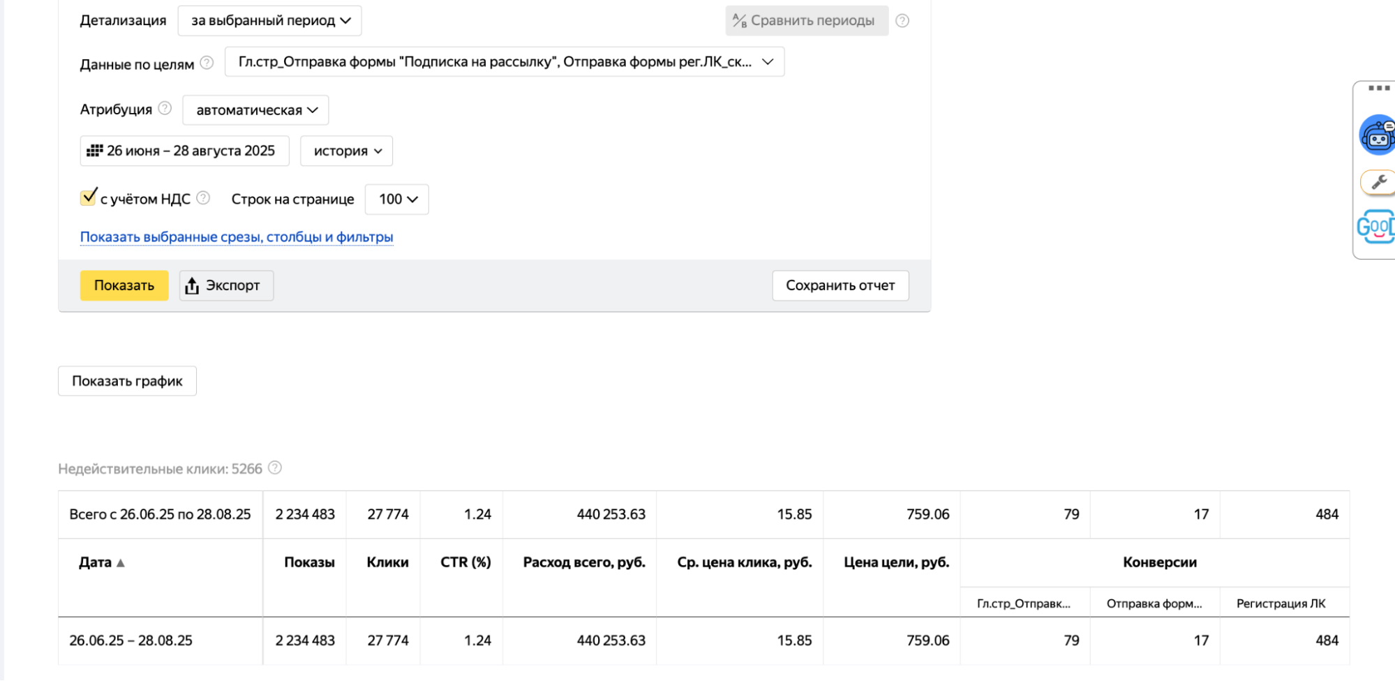 В процессе работы снизили CPA до 465 ₽ – отличная стоимость за регистрацию в настолько узкой нише. У кампании есть потенциал для дальнейшего снижения цены за счёт дополнительной оптимизации. Кроме того, в нише достаточно трафика для увеличения бюджета и масштабирования.