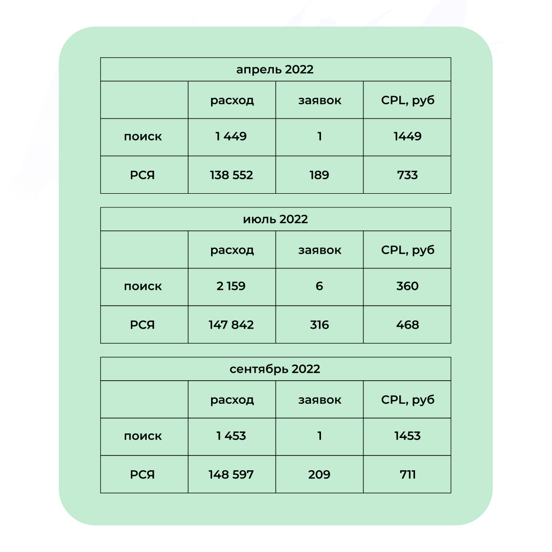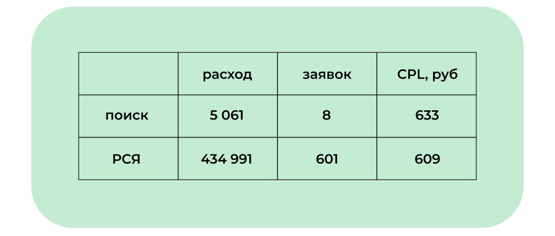 Основной трафик — РСЯ, на Поиске только — брендовые запросы, чтобы снизить стоимость клика и заявки.