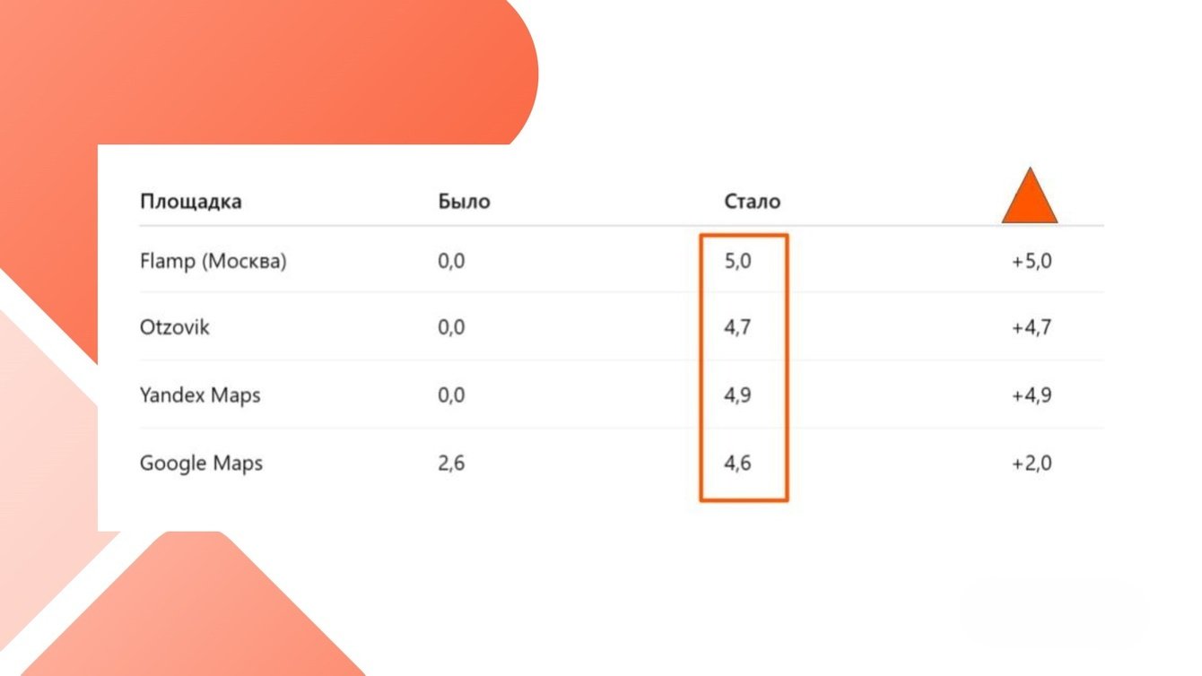 - средний рейтинг на геосервисах вырос на 160% (с 1,85 до 4,80);