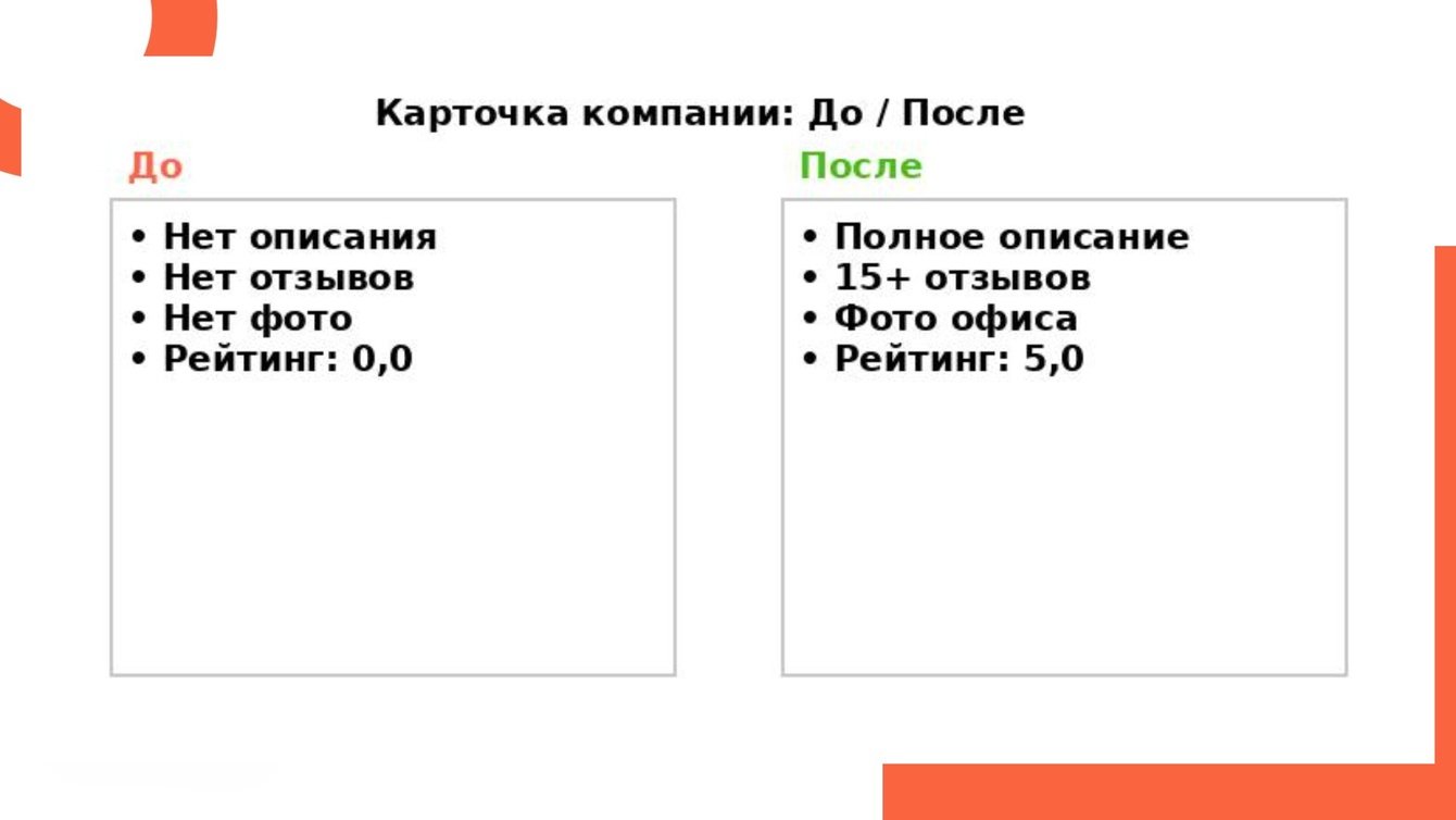 - карточки компании на отзовиках и геосервисах были пустыми;