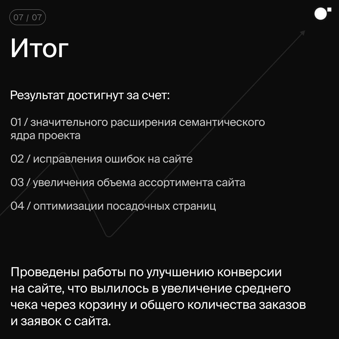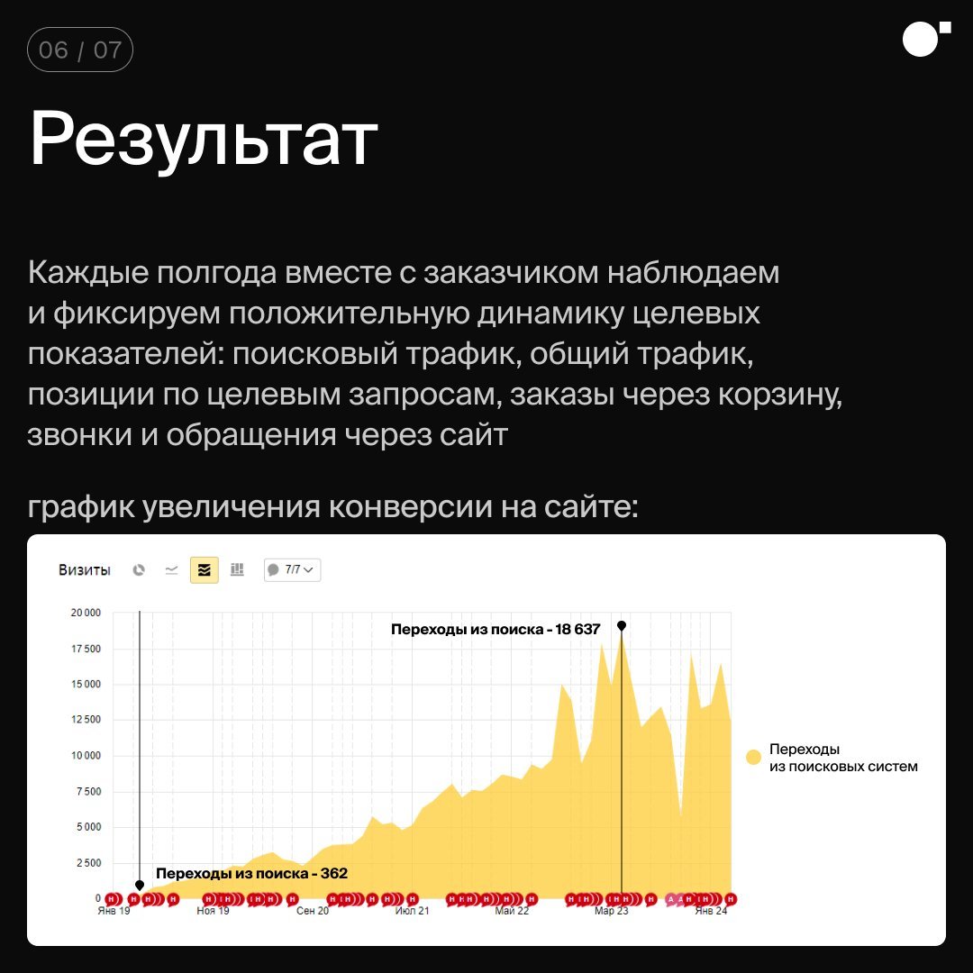 Глобальной целью было занять первые места в поисковой выдаче Яндекса и Google. В начале проекта было всего 362 перехода из поиска, но благодаря проведенным мероприятиям этот показатель вырос до 18 600 переходов. Достижение успеха было обеспечено расширением семантического ядра проекта, исправлением ошибок, увеличением ассортимента товаров на сайте и оптимизацией посадочных страниц. С увеличением трафика на сайте, стало очевидно, что конверсия требует улучшения. Были проведены работы по оптимизации конверсии, что привело к увеличению среднего чека через корзину и общего количества заказов и заявок с сайта.