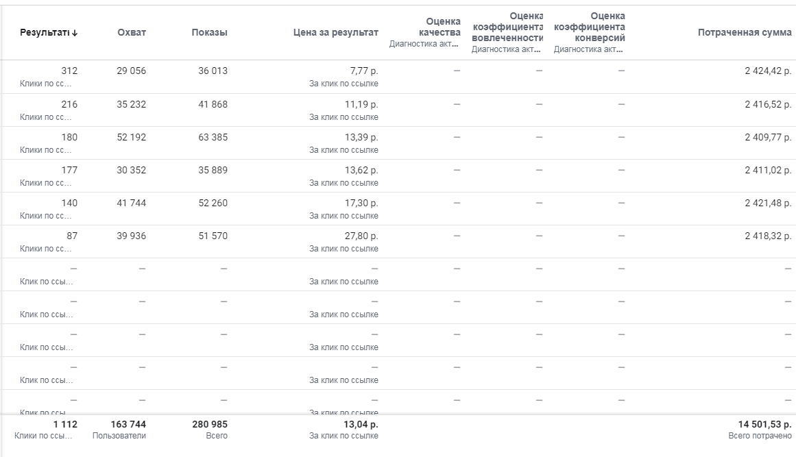 Получили 1 112 переходов, цена за клик 13 рублей что всех устраивает.