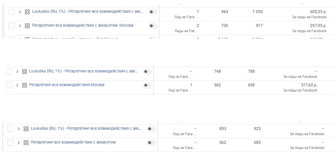 Последние две гипотезы себя не оправдали, лидов было мало а те что приходили были дорогими. Вообще look-a-like рекомендуется настраивать на горячую аудиторию, например на список купивших или хотя бы оставивших заявки. Так более высока вероятность что фейсбук найдет нам нужную аудиторию. Но наша задача было протестировать, вот мы и тестировали. Зато лить трафик на всю Россию оказалось очень выгодно.
