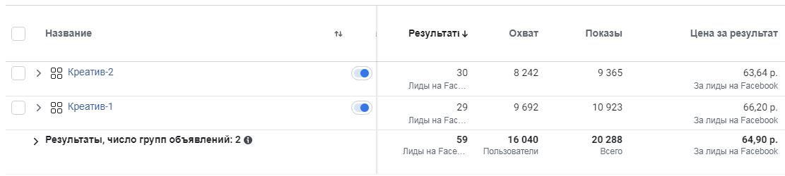 Также было решено самые эффективные креативы запустить в рекламу на лиды.