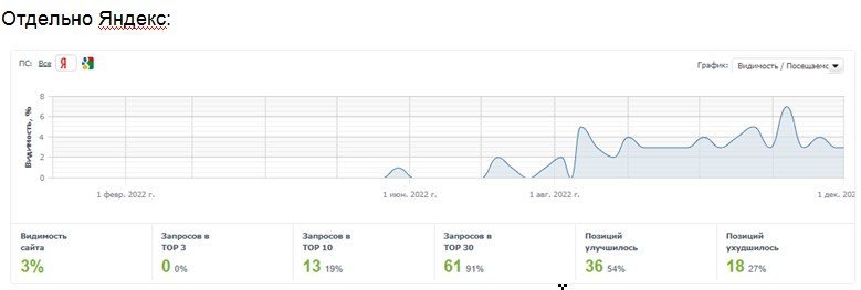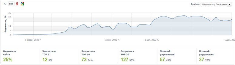 На конец 2022 года среднемесячное количество поискового трафика увеличилось до 57,5 тысяч, из них количество переходов из Google составило 46,5 тысяч. Появилась видимость в Яндексе (10,8 тысяч переходов).